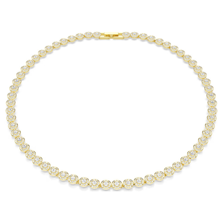 Capturing a look of timeless sophistication, this radiant Una necklace is one of Swarovski's most cherished silhouettes. The gold-tone plated design features a full surround of large round-cut crystals, each framed by a halo of clear pavé. The foldover clasp delivers a seamless closure, while the additional extender means you can adjust the jewelry for both comfort and size. A perfect way to accentuate the glamour in your day-to-night styling.